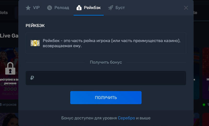 Переход к ставкам на реальные деньги требует пополнения баланса от 500 рублей. Максимальная ставка в слотах достигает 50 000 рублей, в VIP-играх — до 200 000 рублей за спин.